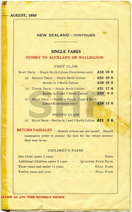 Shown below are four pages of a brochure displaying proposed voyages and fares of the vessel from December 1949 to August 1950.